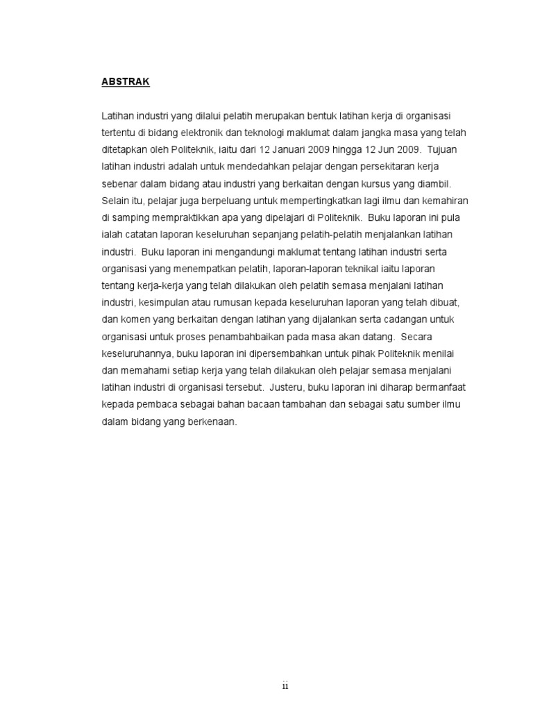 Contoh abstrak untuk laporan latihan industri. Contoh buku laporan latihan industri politeknik jabatan perdagangan laporan 7. Contoh laporan latihan industri full 1.